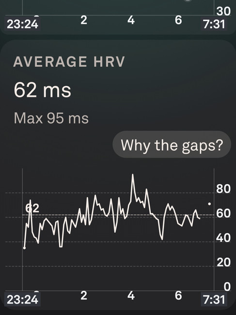 The HRV picture tells the same story through a more sensitive instrument, but with one additional layer of resolution. In the days preceding the session a visiting friend had disrupted normal routine - travel, irregular meals, later nights including New Year's Eve, some alcohol, and HRV reflected this, varying between 40 and 54. The overnight trace following the session shows a genuine suppression signal in the first half of the night, HRV sitting in the low-to-mid 40s as the system managed the acute aftermath of threshold work. What is unusual is what happened next. Rather than remaining suppressed across the full sleep period, as is typical after zone 4 glycolytic work, HRV climbed progressively through the second half of the night, peaking at 79 ms, well above the pre-session range. By morning the above-baseline rebound was already established. The suppression arc existed. It simply completed within hours rather than days.
